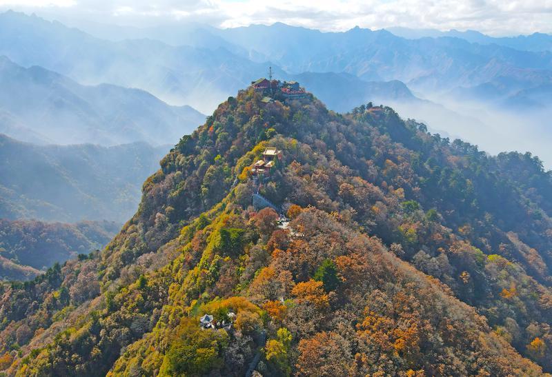 秋冬之交的南五臺景區,恰似大自然以五彩顏料暈染的絕美長卷。南五臺坐落于秦嶺終南山中段北麓,獨特的褶皺斷塊地貌讓這里的景觀層次豐富而立體。登上南五臺之巔,向遠方眺望,漫山的紅葉如熾熱云霞翻騰,黃葉似碎金肆意鋪灑,再加上錯落其中的古寺樓宇、曲折山道,共同勾勒出一幅雄渾又秀美的山水勝景。