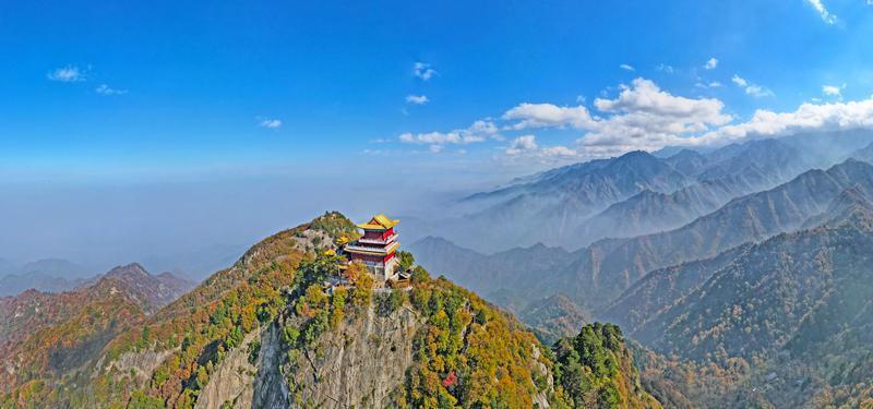秋冬之交的南五臺景區,恰似大自然以五彩顏料暈染的絕美長卷。南五臺坐落于秦嶺終南山中段北麓,獨特的褶皺斷塊地貌讓這里的景觀層次豐富而立體。登上南五臺之巔,向遠方眺望,漫山的紅葉如熾熱云霞翻騰,黃葉似碎金肆意鋪灑,再加上錯落其中的古寺樓宇、曲折山道,共同勾勒出一幅雄渾又秀美的山水勝景。