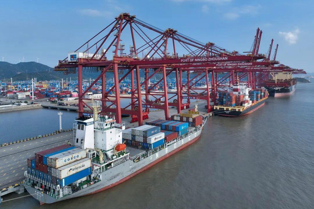 在寧波舟山港金塘港區大浦口集裝箱碼頭,船舶進行集裝箱裝卸作業。新華社發(鄒訓永攝)