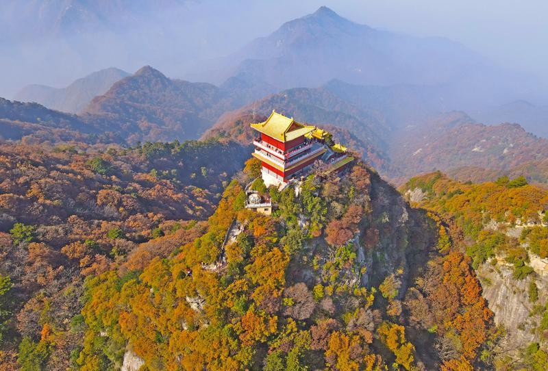 秋冬之交的南五臺景區,恰似大自然以五彩顏料暈染的絕美長卷。南五臺坐落于秦嶺終南山中段北麓,獨特的褶皺斷塊地貌讓這里的景觀層次豐富而立體。登上南五臺之巔,向遠方眺望,漫山的紅葉如熾熱云霞翻騰,黃葉似碎金肆意鋪灑,再加上錯落其中的古寺樓宇、曲折山道,共同勾勒出一幅雄渾又秀美的山水勝景。